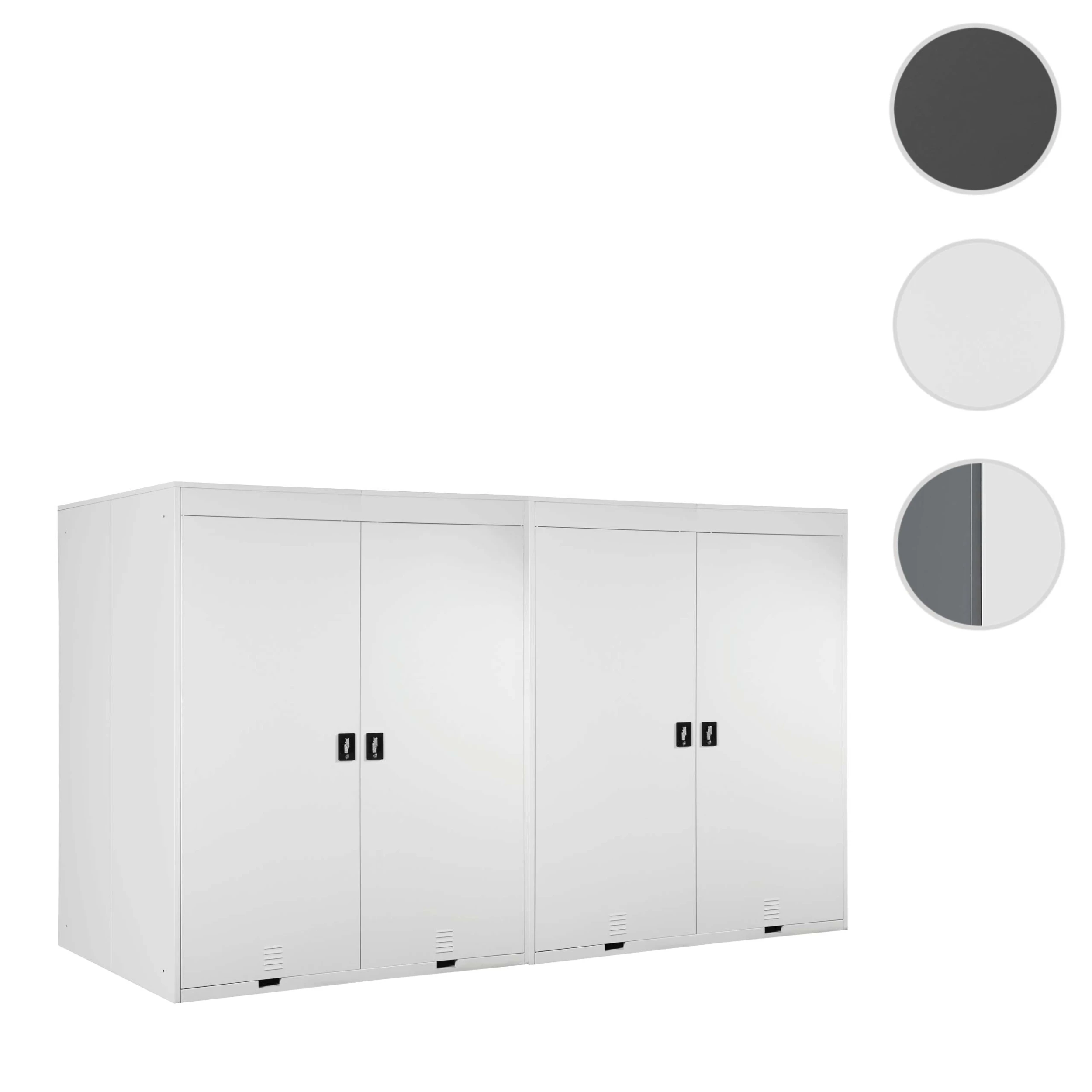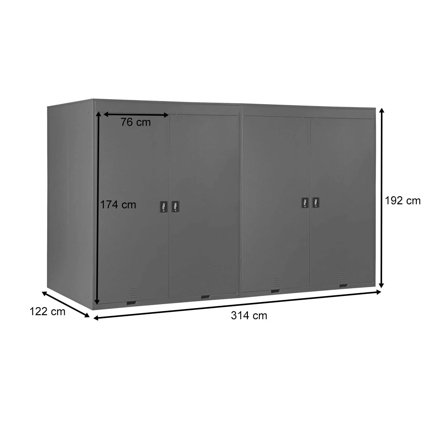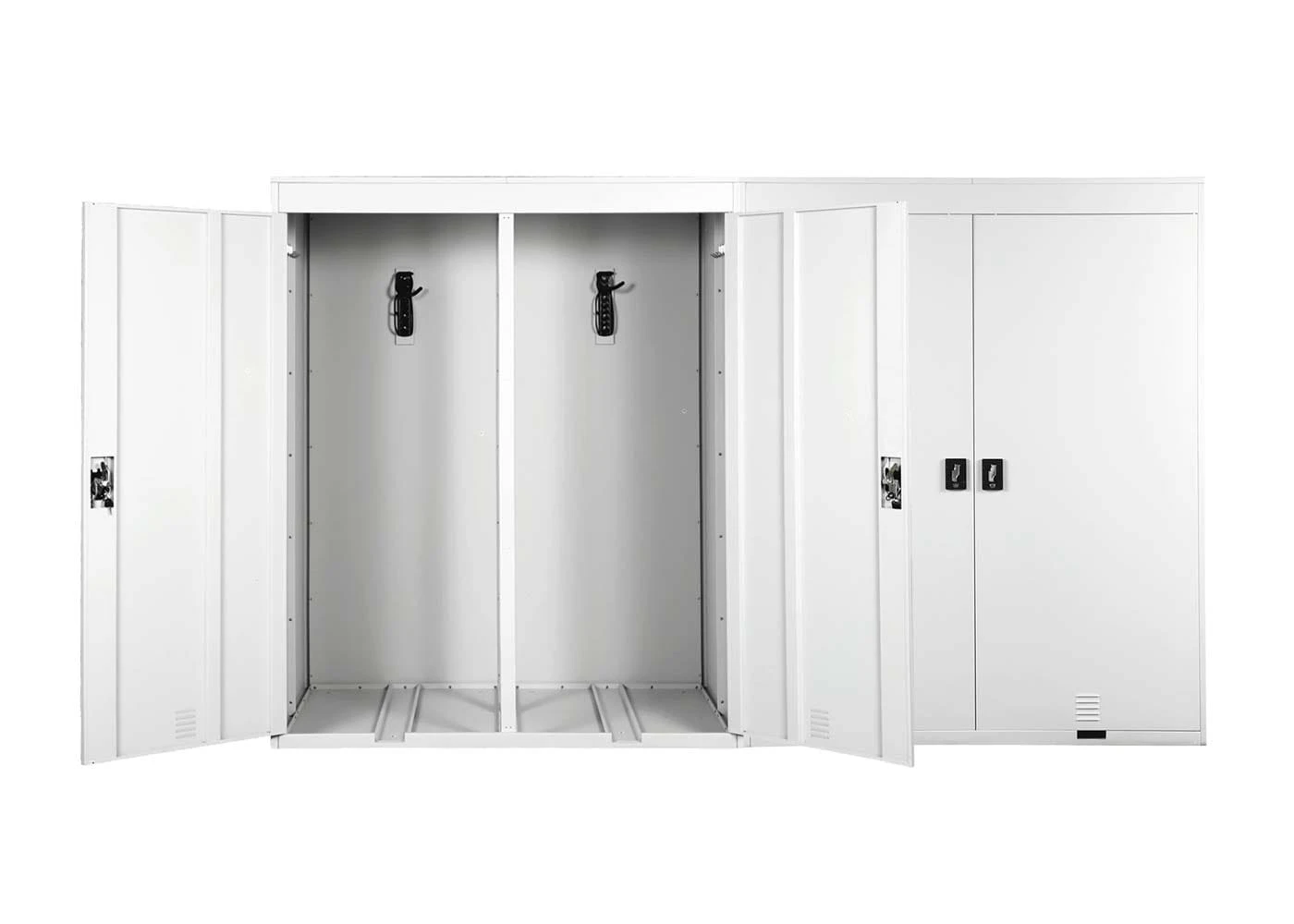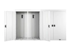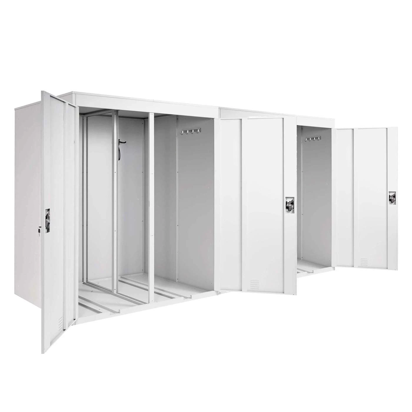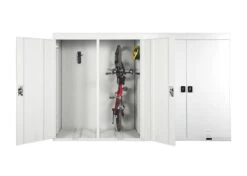 In der Fahrradbox ist Platz für vier Räder, diese werden an einer Vorrichtung mit dem Vorderrad aufgehängt. Praktischerweise finden Sie in den Kabinen, zwei Hakenleisten mit je vier Haken, an denen Sie zum Beispiel Ihren Helm, Regenkleidung, Fahrradschlösser oder Ähnliches verstauen können. Auch nasse Kleidung kann problemlos in der Box untergebracht werden, da durch luftdurchlässige Aussparungen für eine gute Luftzirkulation gesorgt ist. Die Türen sind selbstverständlich abschließbar, so sind Ihre Fahrräder immer vor Diebstahl und schlechtem Wetter geschützt.