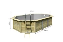 Mit einer Wassertiefe von 111 cm, die sich über die Pool Diagonale von über 6,2 Metern erstreckt, können Sie ganz bequem Schwimmen oder sogar Tauchen. Insgesamt warten hier rund 19.000 Liter Wasserinhalt darauf, von Ihnen erobert zu werden. Der Einstieg gelingt bequem über die mitgelieferten Einstiegsleitern aus Edelstahl für die Innenseite und Holz für die Außenseite.