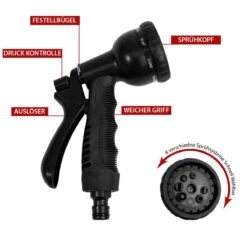 MULTIFUNKTIONELLER SPRÜHKOPF bietet 8 verschiedene Sprühfunktionen: Kegel-/Düsen-/Mittel-/Dusch-/Spül-/Flach-/Tropf-Strahl und Sprühnebel Die Anschlüsse am Schlauch passen an alle handelsüblichen Anschlüsse wie z.B. Gardena oder Kärcher