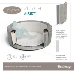 Der LAY-Z-SPA® ECO-Whirlpool Zurich AirJet™ 180x66x bietet Platz für bis zu 4 Personen. Der ECO-Whirlpool in Alabaster-Optik überzeugt durch innovatives EnergySense-Material, das bis zu 40% Energie spart. Ausgestattet mit hochklappbarem Soft-Touch-Display, Stromspar-Timer, Stromspar-Abschaltautomatik, in der Pumpe integriertem Getränkehalter und Ablagefläche. Mit Hochleistungs-Heizsystem, Frostwächter-Technologie, Sprudelmassage (120 AirJet™ -Düsen) und Filtersystem. Der Pool ist GS-zertifiziert, sowie Tastensperre und Kindersichere Clipverschlüsse. Aufbau ohne Werkzeug möglich. 2-teiliger isolierender Thermo-Abdeckung, Lieferumfang: ChemConnect™ Chemikaliendosierer, 2 Flowclear™ Filterkartuschen, selbstklebendem Reparaturflicken, integriertem Ablassrohr und Adapter, sowie Spa-Pumpe.