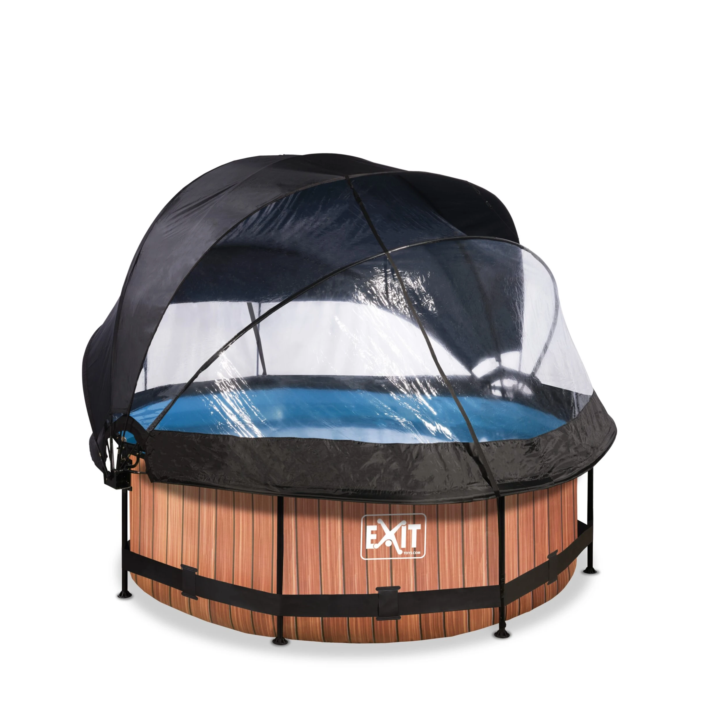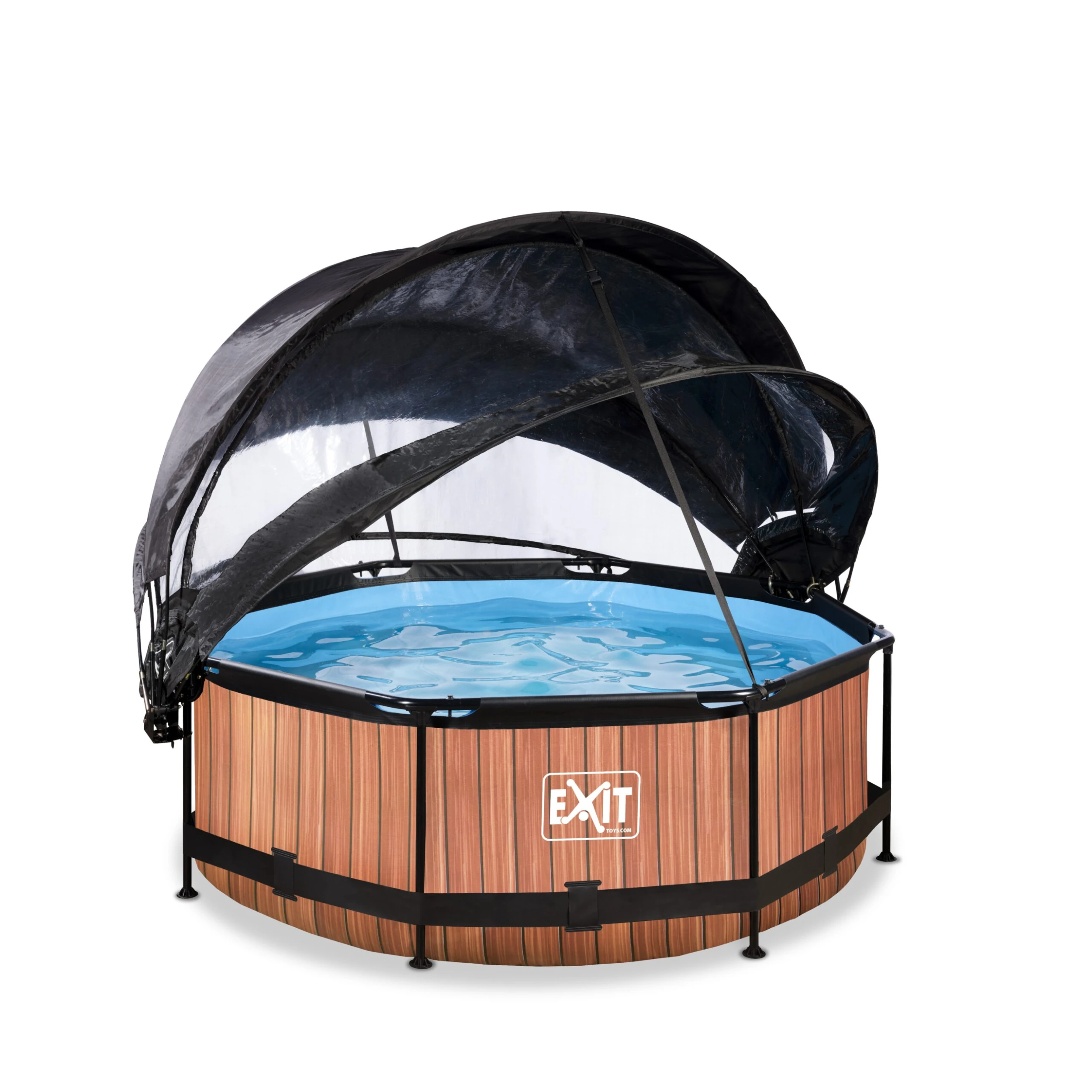 Der EXIT Wood Pool ø244x76cm ist ein runder Rahmenpool mit Abdeckung und Sonnensegel.