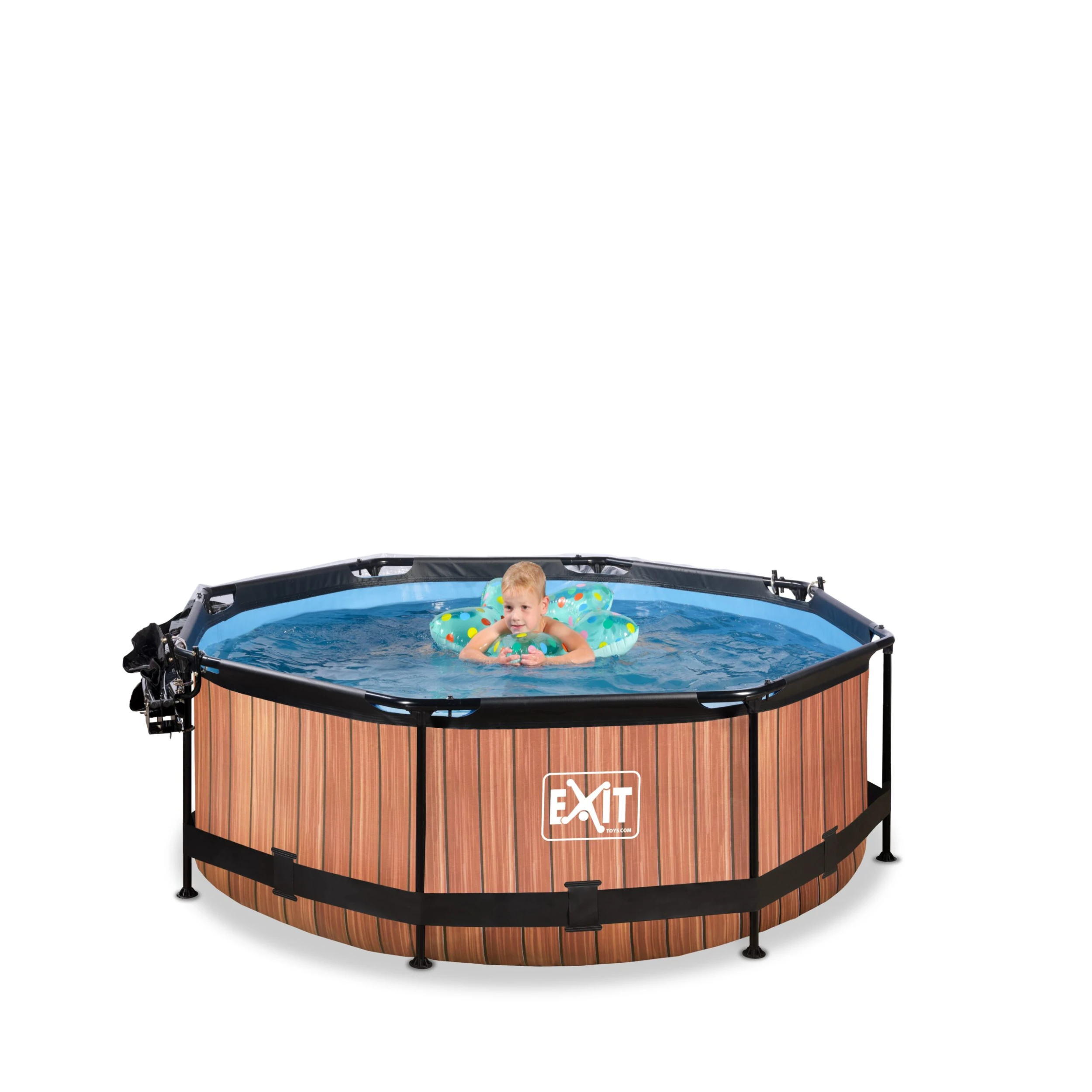 Der kompakte Pool ist standartmäßig mit einer Filterpumpe ausgestattet und fällt durch sein tolles Holzmuster zwischen anderen Pools auf.