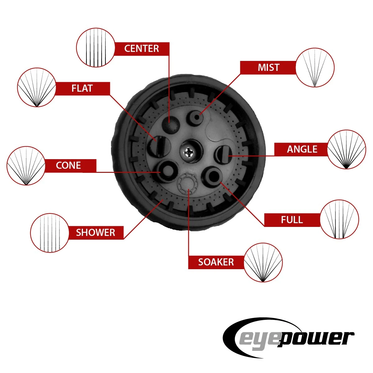 Die mitgelieferte Pistolengriffbrause verfügt über 8 verschiedene Sprühfunktionen: Center, Mist, Angle, Full, Soaker, Shower, Cone, Flat. Am Kopf der Brause sind deutliche Markierungen angebracht und die Sprühmuster lassen sich mühelos einstellen.