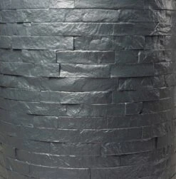 Regenspeicher in runder Formgebung mit täuschend echt wirkender Steinstruktur.