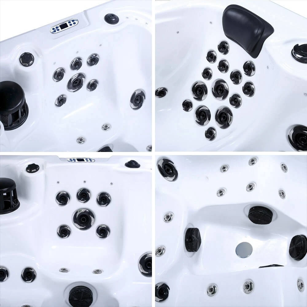 Durch das eingebaute Display am Rande des Whirlpools lassen sich verschiedene Funktionen regeln. Sie können hier nicht nur die Temperatur, sondern auch die Massagedüsen und das Licht bedienen. Eine weitere Besonderheit bietet die stabile Einstiegtreppe aus Holz, die bereits im Preis inbegriffen ist. Auch eine Schutzabdeckung ist im Lieferumfang enthalten. Die Zirkulationspumpe kann manuell auf 2 verschiedene Geschwindigkeiten gestellt werden. Zusätzlich erhalten Sie von uns ein passendes Filterset. Da Sie den Pool bereits mit allen nötigen Teilen geliefert bekommen, können Sie ihn direkt nach Anschließen an das Stromnetz nutzen. Die Reinigung erfolgt automatisch durch das Ozon-Reinigungssystem. Bei tiefen Außentemperaturen sorgt die 10 cm starke Thermoabdeckung für geringstmöglichen Wärmeverlust des Wassers. Mittig zusammengeklappt kann sie problemlos getragen und verstaut werden. Ein eingebauter Insektenschutz sorgt dafür, dass sich keine lästigen Insekten im Innenraum, an der Pumpe oder der Heizung sammeln können.