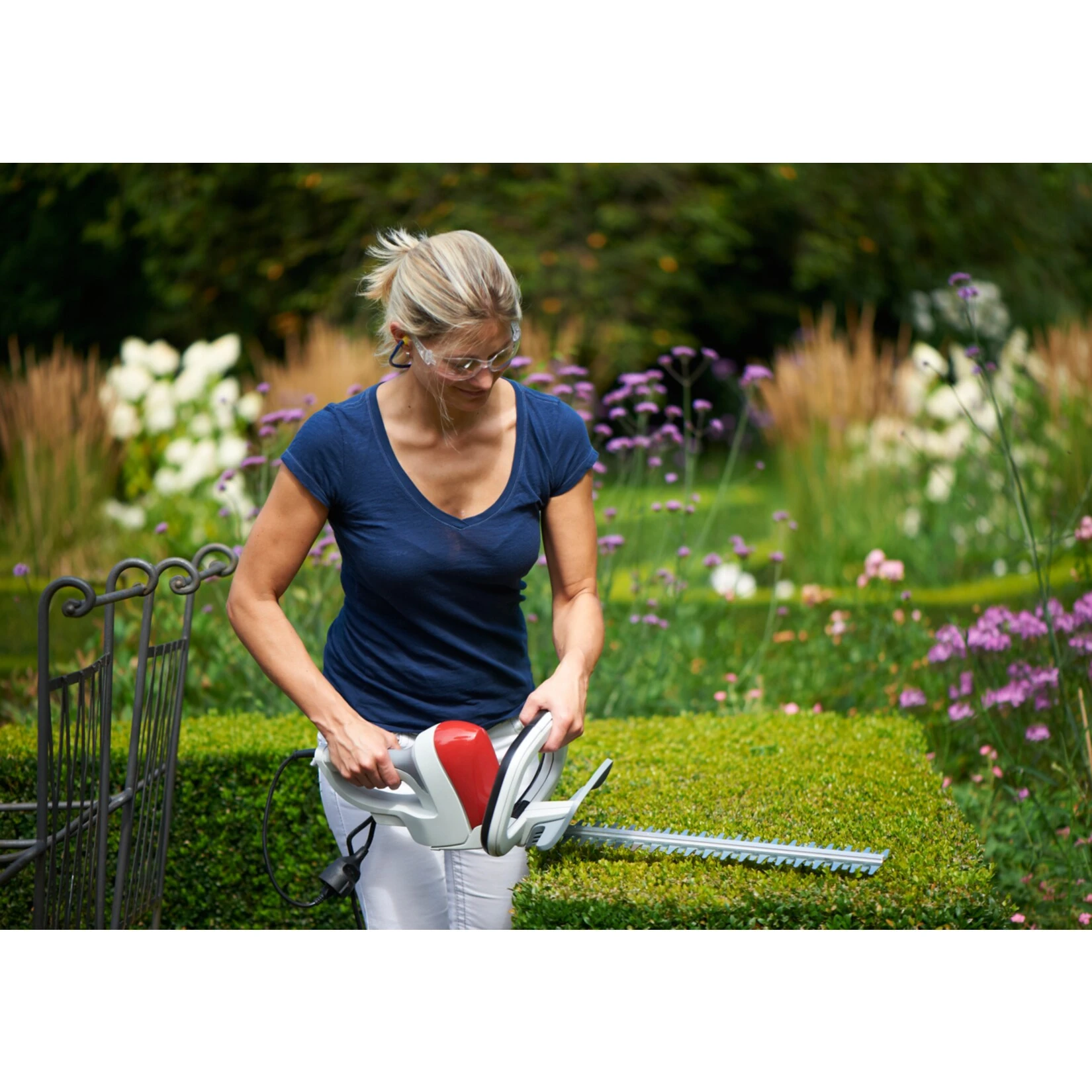 Zudem ist die Heckenschere mit laser- und diamantgeschliffenen Messer ausgestattet und zeichnet sich durch den leistungsstarken 550 W Motor und der komfortablen Schnittlänge von 55 cm aus.