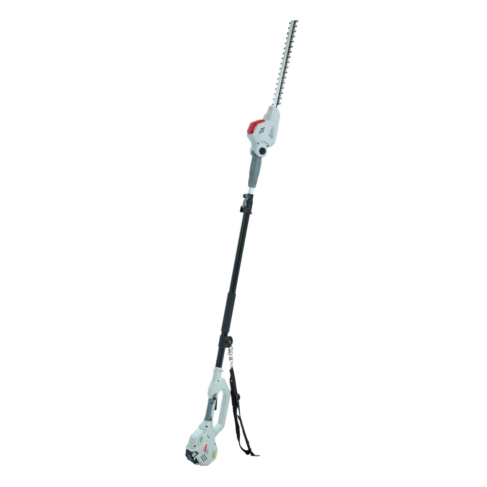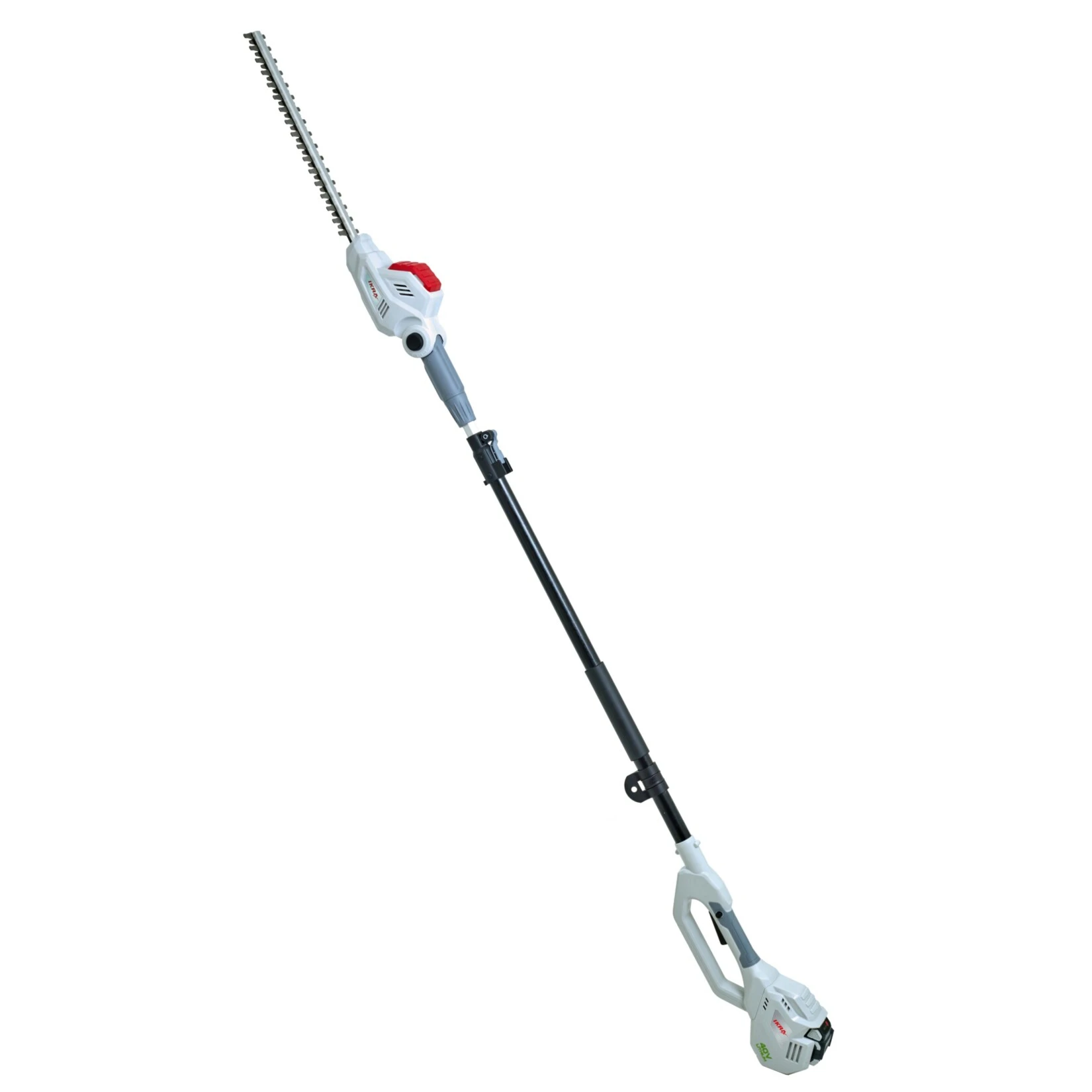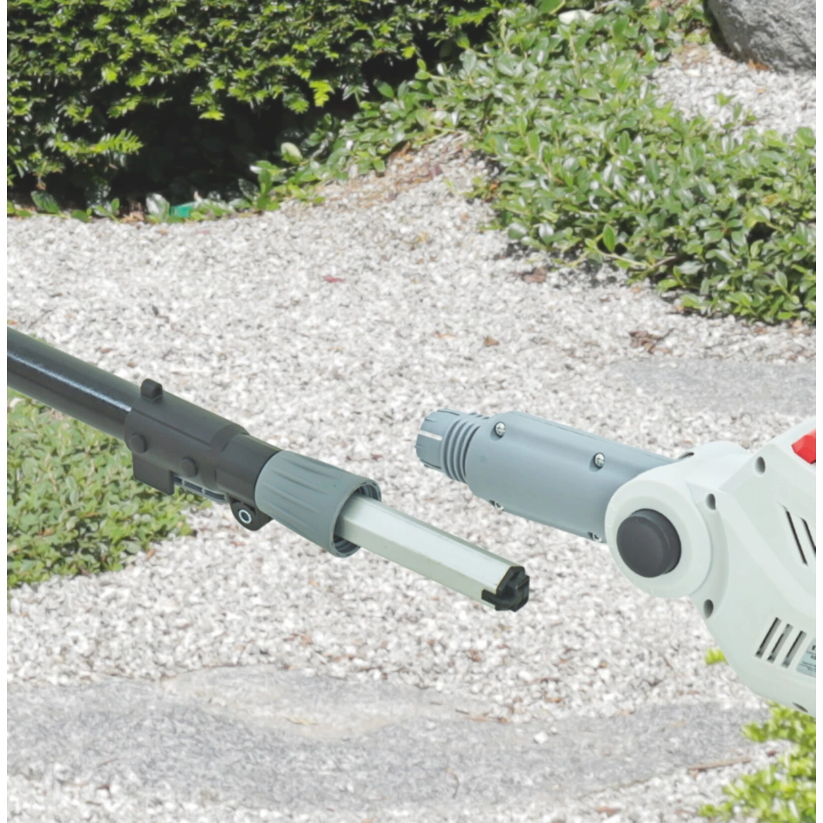 Der bis zu 112,5° abwinkelbare Schneidkopf erleichtert das Arbeiten in allen Positionen, während der Handgriff sowie die Teleskopschaft mit komfortablen Softgrip für einen angenehmen und sicheren Halt sorgen.