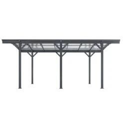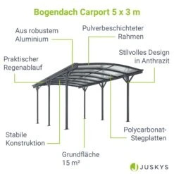 Der robuste Carport mit Bogendach bietet auf 15 m² effektiven Schutz vor Sonne, Regen und anderen Wettereinflüssen für Ihr Fahrzeug. Die Konstruktion aus leichtem und zugleich belastbarem Aluminium ist dank der Pulverbeschichtung witterungsbeständig und sorgt für eine lange Lebensdauer. Im Dach sind 6 mm starke Doppelstegplatten mit praktischem UV-Schutz verbaut. Sie bieten nützliches Oberlicht, welches zumindest tagsüber weitere Lichtquellen unnötig macht. Der hochwertige Carport bietet Ihnen ausreichend Platz und ein schützendes Dach für Ihren PKW, Motorräder, Fahrräder oder sogar ein kleines Boot. Alternativ können Sie das Produkt auch ganzjährige als Terrassenüberdachung verwenden.