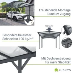 Der Carport ist für eine freistehende Montage ausgelegt und kann somit flexibel und unabhängig von anderen Wänden aufgestellt werden. Dank der robusten Bodenverankerung der Pfosten wird dennoch eine hohe Stabilität erreicht. Mit der detaillierten Anleitung montieren Sie den Bausatz im Handumdrehen.