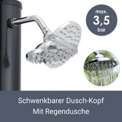 Sie haben einen Pool, lieben Camping oder brauchen einfach nur eine kühle Erfrischung an heißen Sommertagen? Mit der Solardusche „Victoria“ von Juskys liegen Sie genau richtig. Die schlichte Outdoor-Dusche in klassisch schwarzem Design und aus robusten Materialien ist durch den großen schwenkbaren Regen-Duschkopf ein Spaß für die ganze Familie. Der 20 l Wasser-Tank sorgt zusammen mit der stufenlosen Temperatur-Regelung für eine einfache und angenehme Einstellung der Wunsch-Temperatur. Durch den massiven Fuß entsteht ein sicherer Stand.