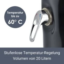 Stellen Sie dank der stufenlosen Temperatur-Regelung angenehm Ihre Wunschtemperatur von bis zu 60 °C individuell ein. Der integrierte Wasser-Tank mit einem Volumen von 20 Litern stellt eine fortlaufende Verfügbarkeit von Warmwasser sicher.
