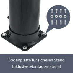 Die Gartendusche ist mit einer 15,5 x 15,5 cm großen Bodenplatte aus PVC ausgestattet. Diese wird mit 4 Schrauben fest im Boden verankert und gibt einen sicheren Stand.