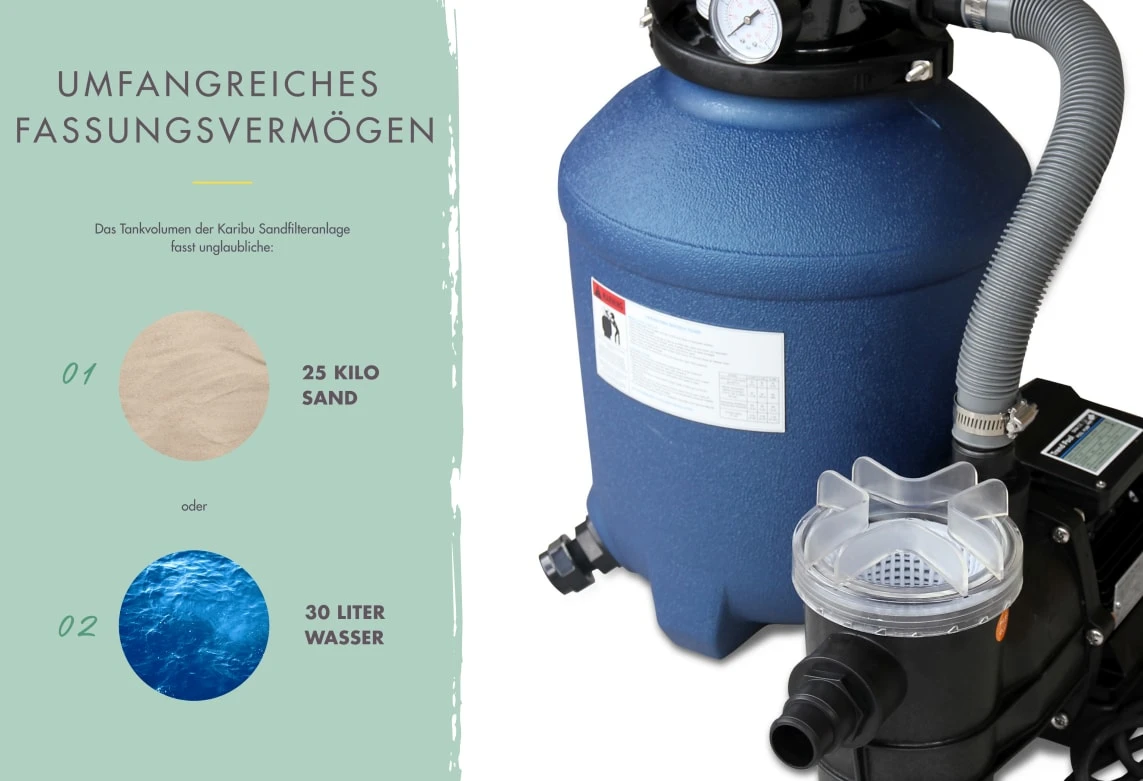 Sauberer Pool durch die kraftvolle Sandfilteranlage, die für Filtersand geeignet ist. Halten Sie Ihr Schwimmbecken auch bei hoher Poolnutzung stets sauber und tauchen in glasklares Wasser ein.