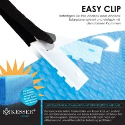 Nutznießen Sie von einer einfachen und schnellen Montage dank dem cleveren Klettsystem und der einfachen Zusammenführung der Stangen. Die rutschfesten Griffmöglichkeiten an der Poolaufroller–Konstruktion bieten Ihnen zusätzliche Stabilität bei Aufrollprozessen. Befestigen Sie Ihre Abdeckplane oder Solarplane schnell und einfach mit den stabilen Klammern.