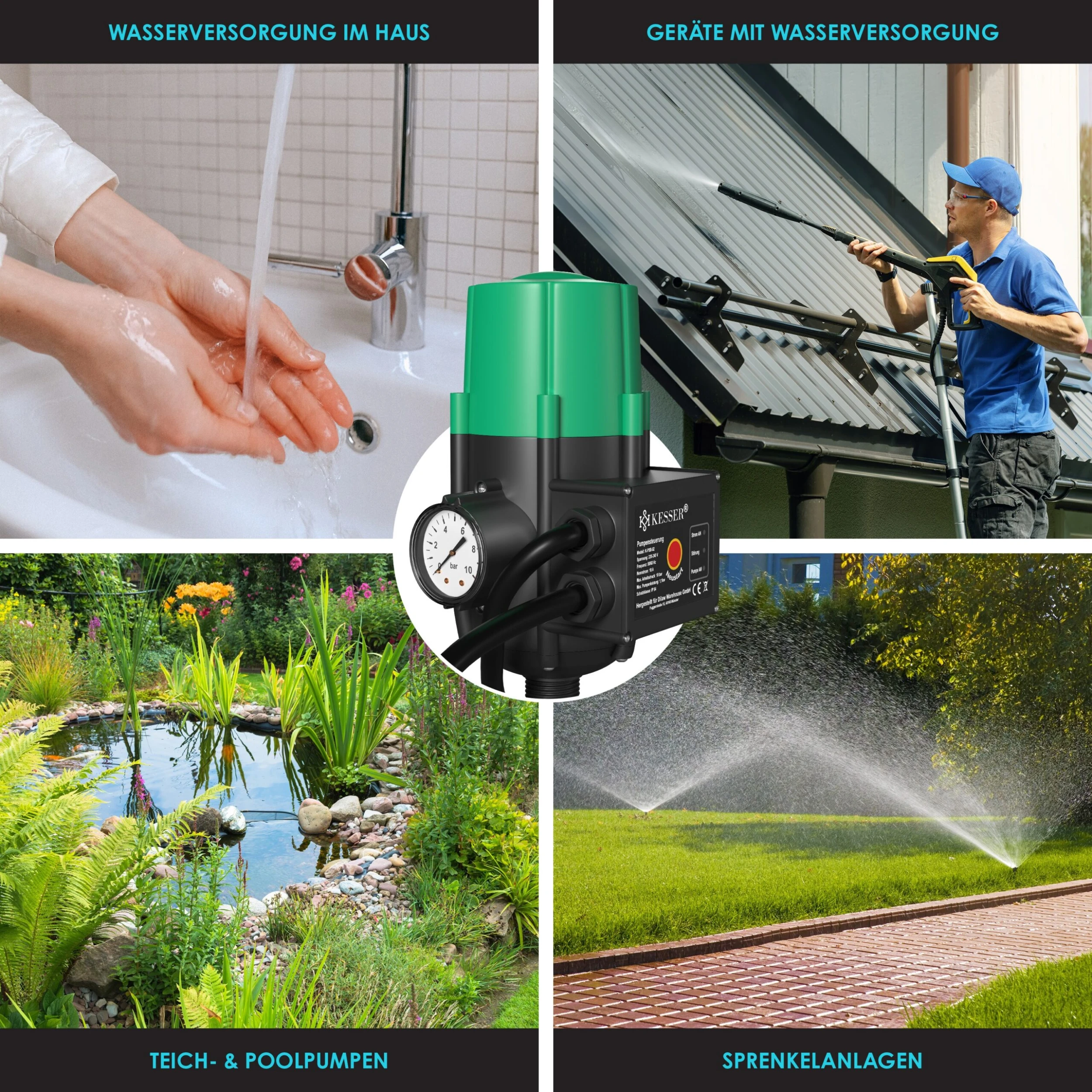Dieser Druckschalter von KESSER sorgt für einen konstanten Wasserdruck bei der Gartenbewässerung oder Hauswasserversorgung. Mit der Pumpensteuerung wird die Wasserpumpe automatisch gestartet und gestoppt in Abhängigkeit vom Öffnen und Schließen des Verbrauchers. Dadurch wird konstanter Druck im Hauswasserwerk garantiert, bei Wassermangel tritt ein Trockenlaufschutz in Kraft, und die Pumpe stoppt. Die Pumpensteuerung beseitigt die Wirkung von Druckstößen.