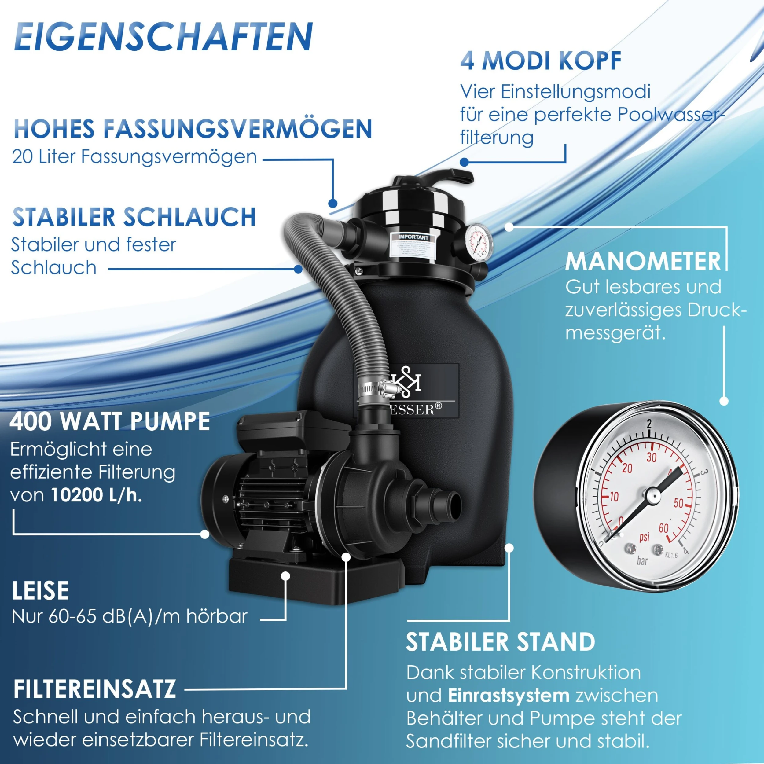 Unsere Sandfilteranlage ist für Poolbesitzer ein wichtiges und hilfreiches Accessoire. Ohne Umwälzung Filterung in Ihrem Pool wird das Wasser sehr schnell trübe und verdirbt die Laune auf den Badespaß. Neben den optisch unschönen Folgen wie Algen, Keimen und sonstiges Verschmutzungen ist die Verfärbung nicht nur unangenehm anzusehen sondern zusätzlich gesundheitsschädlich. Unsere Sandfilteranlage reinigt das Wasser zuverlässig und filtert Schadstoffe heraus.
