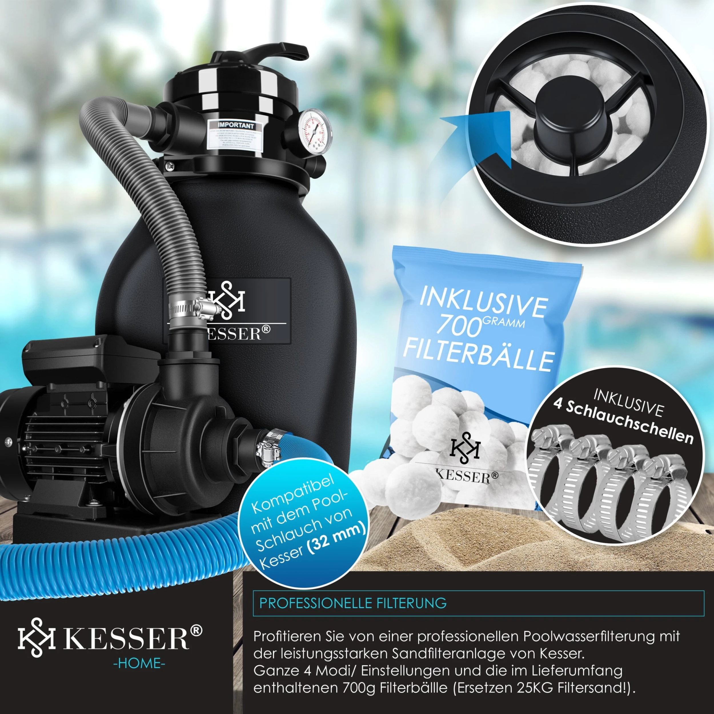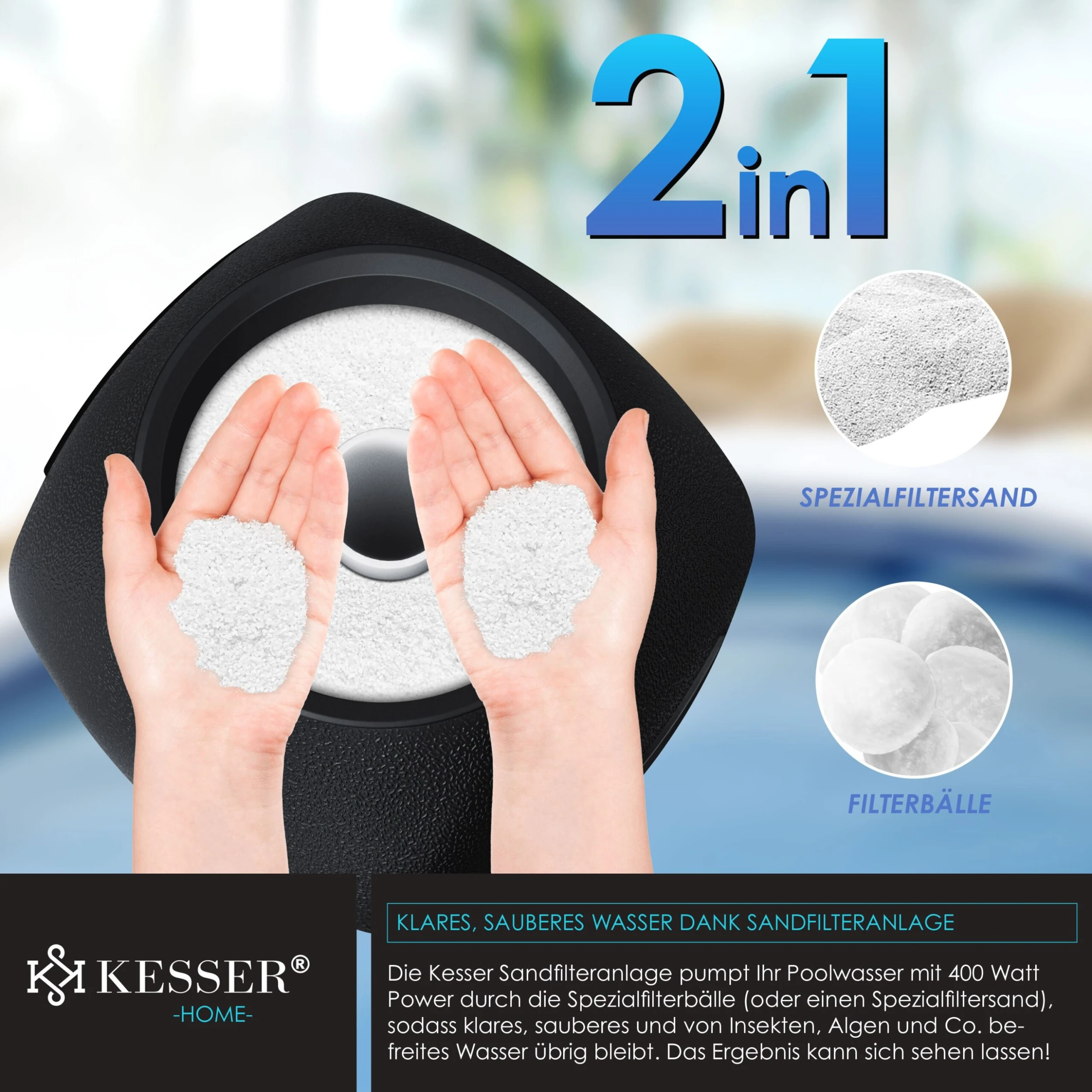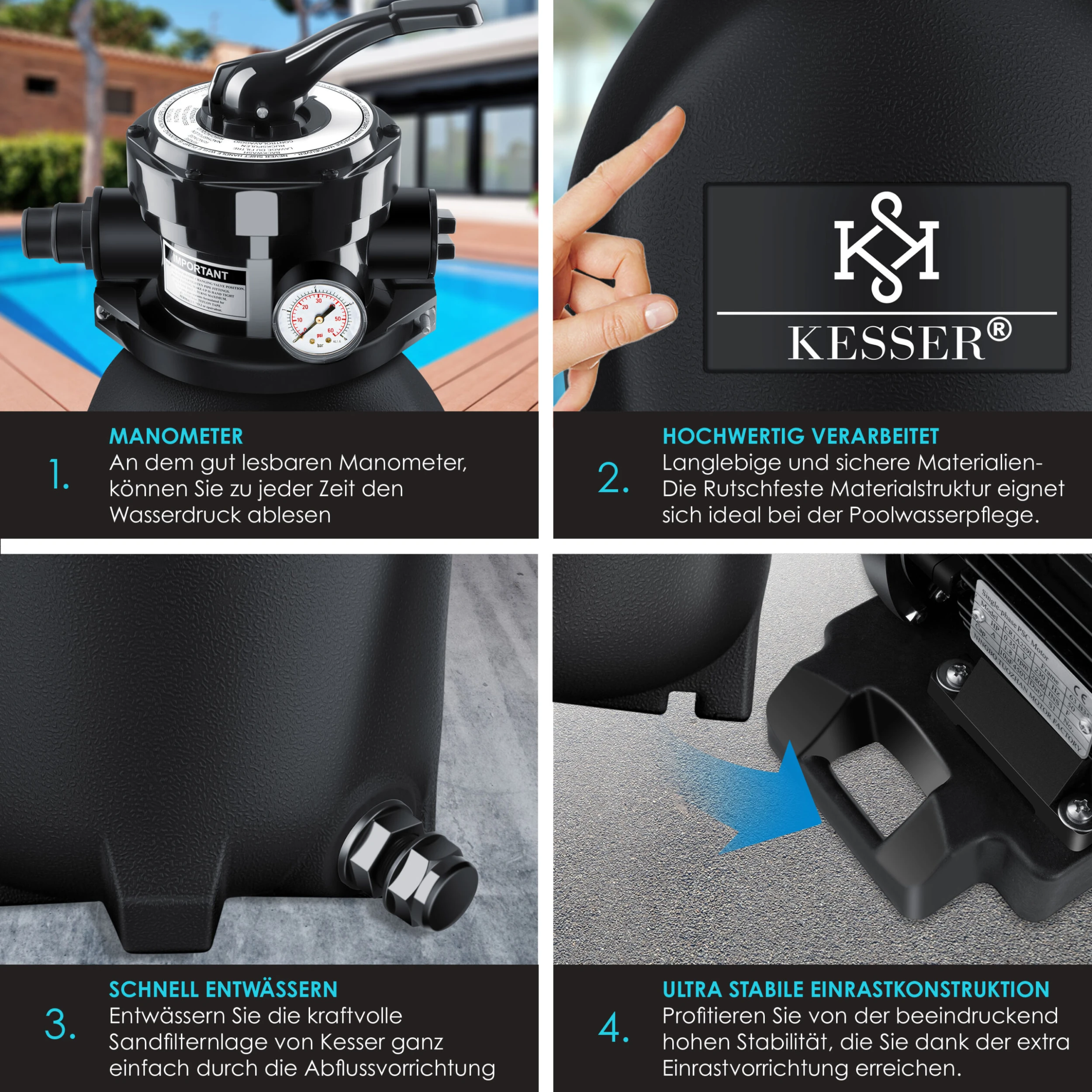 KESSER Sandfilteranlage Inkl. 700g Filterbälle ist mit umfangreichem Zubehör ausgestattet, filtert und reinigt zuverlässig, mit Druckanzeige und leistungsstarker Pumpe