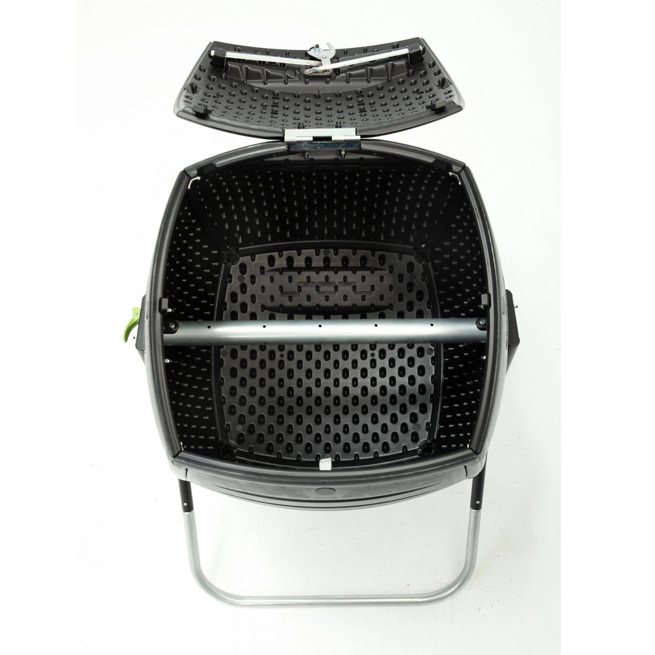 Das gelegentliche Drehen des in mehrere Positionen verstellbaren Kunststoffgehäuses gewährleistet eine rasche Kompostierung. Beim Rotieren der Trommel wird das Kompostgut gelockert, verteilt und dank einer Zufuhr befeuchtet und mit Luft gemischt.