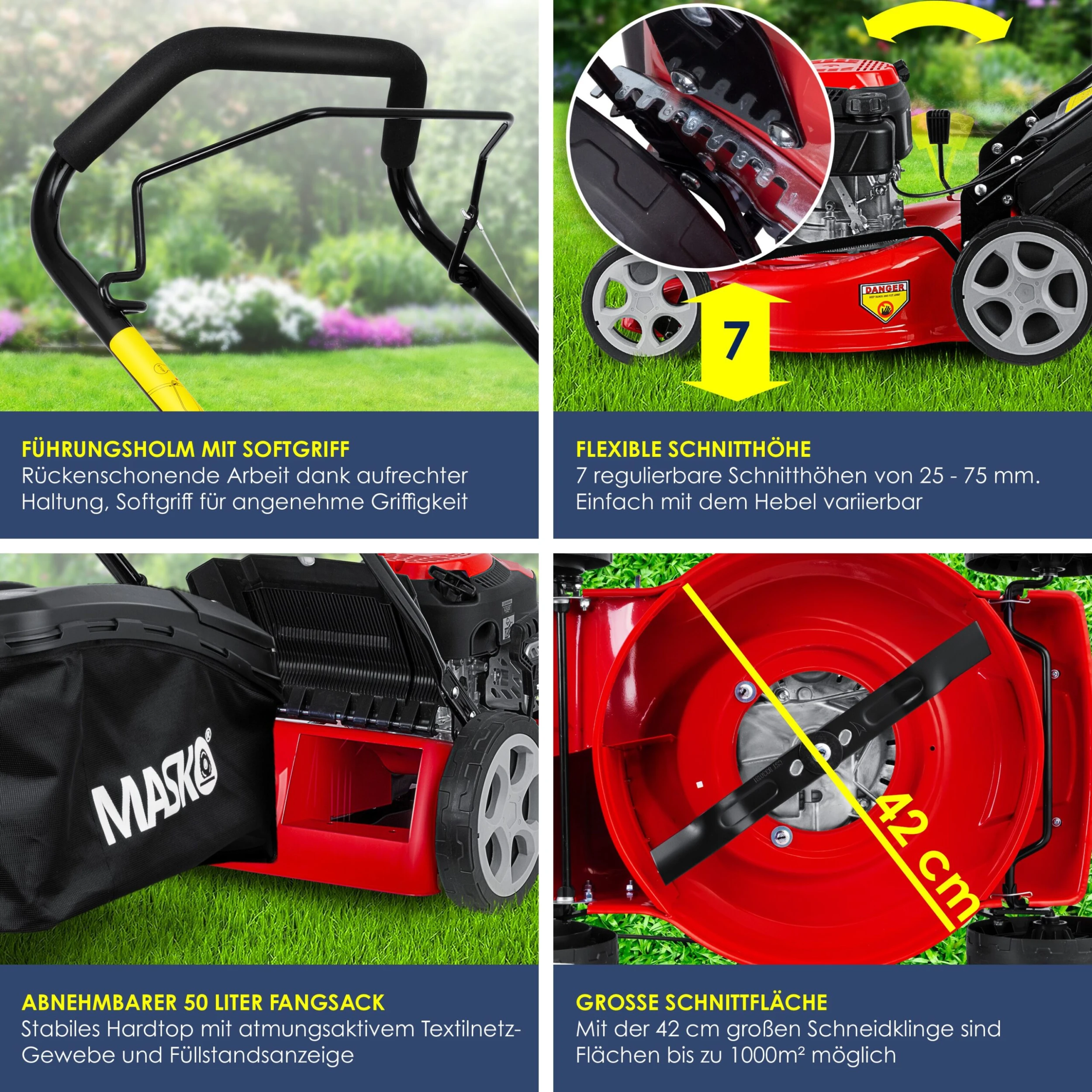 MASKO 5in1 Benzin Rasenmäher mit zuschaltbarem Hinterradantrieb bis 4,3 km/h, schnelle und gleichmäßige Reinigung dank Wasseranschluss, Mulchfunktion und Fangkorb mit hohem Volumen, extra große Schnittbreite von 51cm, Variable Schnitthöhe 8-stufig verstellbar