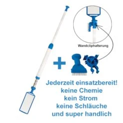 Mit den verschiedenen Zubehörteilen des Pool-Reinigers (Saugdüse, Saugdüse mit breiter Öffnung, Bürstenaufsatz) lassen sich Schmutz und Ablagerungen kinderleicht entfernen.