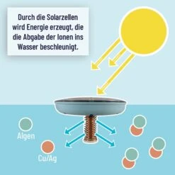 Bereits normales Tageslicht bei bewölktem Himmel reicht aus, damit die Solarzelle eine geringe Menge Strom erzeugt. Der Strom wird über den Kupferzylinder geleitet. Durch den Stromfluss werden Kupfer sowie Silberionen aus dem Kupferzylinder gelöst, die sich dann im Wasser des verteilen. Schon sehr geringe Mengen an Kupfer und Silberionen genügen schon aus, um Algen, Bakterien und auch andere Mikroorganismen abzutöten.