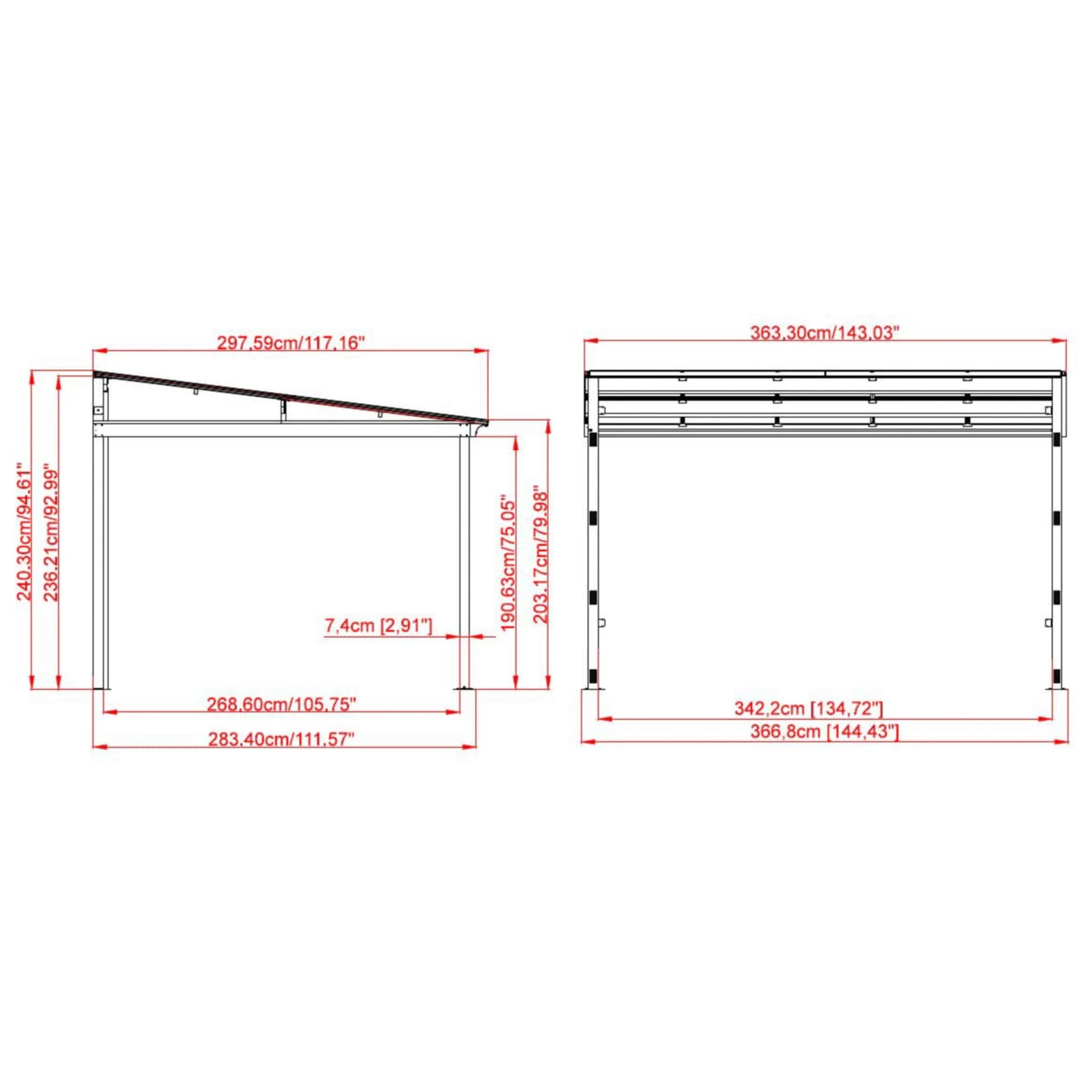 Modern, langlebig und eine tolle Optik sind Merkmale für die neue Aluminium Terrassenüberdachung vom größten und bekanntesten kanadischen Pavillon & Überdachungen Produzenten SOJAG. Die Überdachung St. Barth bietet eine außergewöhnliche Schneelast von 125kg/m² und alle Aluminiumteile sind dauerhaft rostfrei. Das Dach besteht aus 8mm Doppelstegplatten und zwei verstärkten Stangen. Diese Bestandteile gewährleisten eine besonders hohe Stabilität und halten Witterungen wie Regen, Schnee oder Sonne (UV) problemlos Stand. Das Gleiche gilt für die massive Konstruktion aus resistentem, pulverbeschichtetem Aluminium (Pfostenstärke 7,6cm). Selbst die Schrauben bestehen aus rostfreiem Edelstahl. Die Terrassenüberdachung kann somit das ganze Jahr stehen bleiben und muss im Winter nicht abgebaut werden. Die mitgelieferten Schneelaststützen geben Ihrer Überdachung zusätzlichen halt. Inklusive Moskitonetzen aus Nylon und Vorhängen aus 180g/m² Polyester, welche dank zweigleisigem Laufschienensystem zusammen angebracht werden können. Im Gegensatz zu anderen Modellen gilt hier nicht entweder das Eine oder das Andere, sondern hier können sowohl Moskitonetz und gleichzeitig Vorhänge genutzt werden. Befesitgungsclips sind im Lieferumfang vorhanden. Die Terrassenüberdachung kommt in edlem Anthrazit Farbton. Optisch passende Vorhänge (Grau) werden mitgeliefert. Einfacher Aufbau durch 2 Personen mit Hilfe von handelsüblichen Werkzeugen sowie einer detaillierten Schritt-für-Schritt Anleitung. Aufbauzeit ca. 4-5 Stunden. Als Untergrund empfehlen wir eine ebene Fläche aus Holz, Beton oder Pflastersteinen. Schraubenkit zur Verankerung am Boden wird nicht mitgeliefert (12 Schrauben und Dübel).