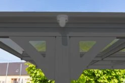 Das Dach aus Doppelstegplatten hält Schneelasten von bis zu 100 kg/m² stand, ist UV-beständig und sorgt für einen hohen Lichteinfall. Ihr Fahrzeug wird vor Wettereinflüssen wie Regen und Schnee geschützt. Durch die mitgelieferte Regenrinne wird das Regenwasser optimal weitergeleitet.